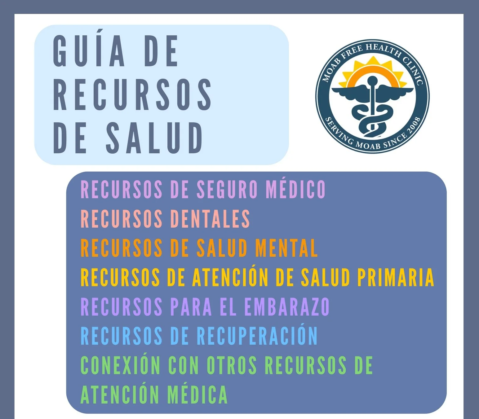 La Clínica Gratis de Salud de Moab creó esta guía de recursos para apoyar a nuestros pacientes con necesidades relacionadas con la atención médica. Encontrará información sobre seguro médico, servicios dentales, salud mental, atención de salud primaria, recursos para el embarazo, recuperación de addición, y otros recursos de atención médica.