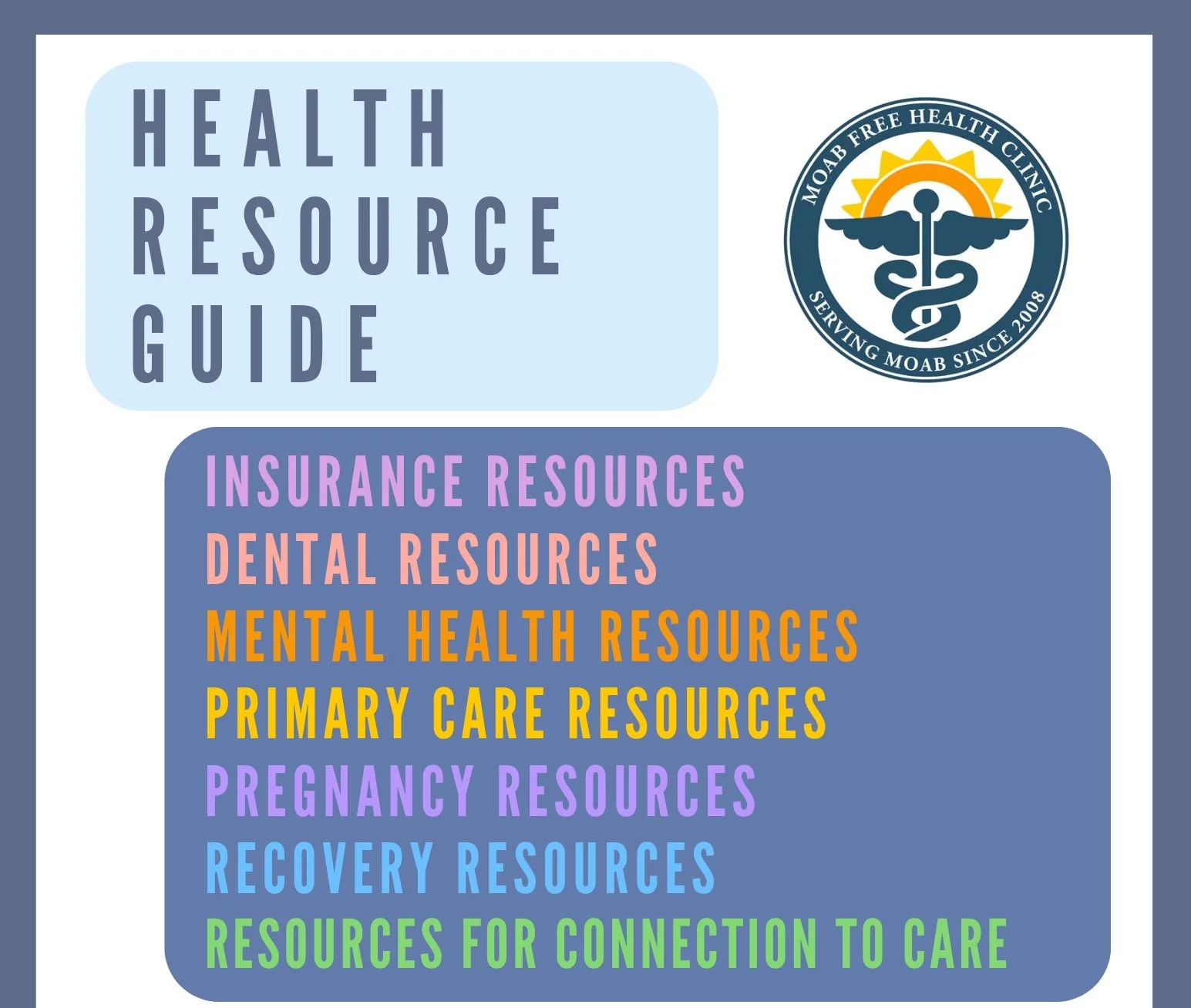 The Moab Free Health Clinic created this resource guide to support our patients with needs related to healthcare. You will find information about insurance, dental services, mental health, primary care, pregnancy resources, addiction recovery, and resources for connection to care.